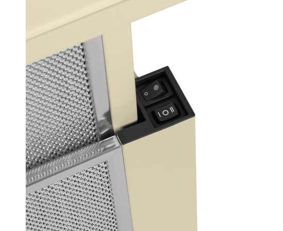 Корпус сделан из нержавеющей стали с высококачественным покрытием бежевого цвета. Фасадная панель из высокопрочного закаленного стекла выполнена в цвет корпуса. Два многослойных жироулавливающих фильтра из алюминия легко вынимаются из вытяжки и полностью разбираются, что сильно упрощает их чистку.