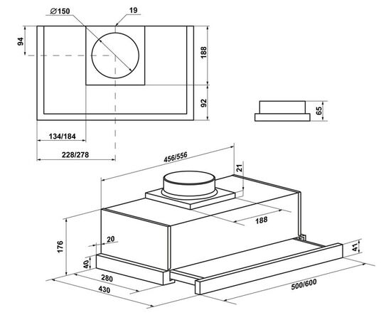 Встраивается в навесной шкаф над варочной поверхностью. Работает в двух режимах – отвода (при подключении вытяжки к системе вентиляции) и рециркуляции (при использовании сменного угольного фильтра в вытяжке).