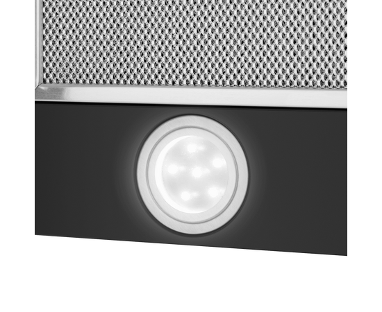 Управление вытяжкой осуществляется двумя клавишными переключателями, скрытых в торце фасадной панели. Вы можете выбрать одну из 2-х скоростей вентилятора и включить освещение (2 светодиодных источника по 1 Вт).