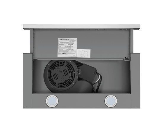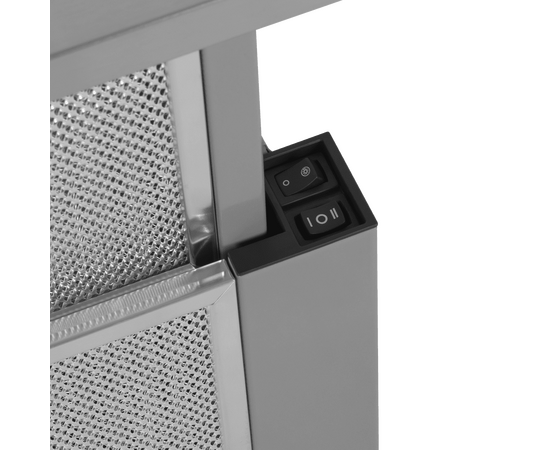 Управление вытяжкой осуществляется двумя клавишными переключателями, скрытых в торце фасадной панели. Вы можете выбрать одну из 2-х скоростей вентилятора и включить освещение (2 светодиодных источника по 1 Вт).