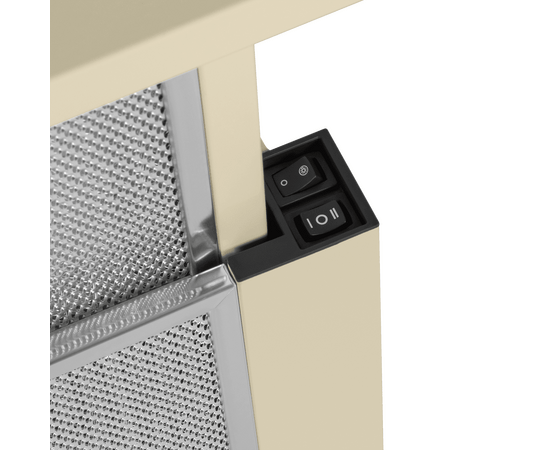 Управление вытяжкой осуществляется двумя клавишными переключателями, скрытых в торце фасадной панели. Вы можете выбрать одну из 2-х скоростей вентилятора и включить освещение (2 светодиодных источника по 1 Вт).