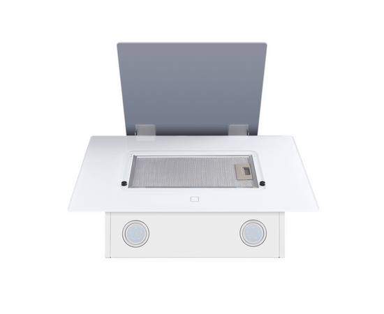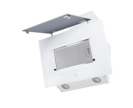 Корпус выполнен из нержавеющей стали. Фронтальная часть состоит из двух панелей из закаленного стекла белого цвета. Откидная панель надежно фиксируется магнитными упорами. За ней скрывается  легко снимающийся металлический жироулавливающий фильтр. Загрязненный воздух втягивается по всему периметру откидной панели.