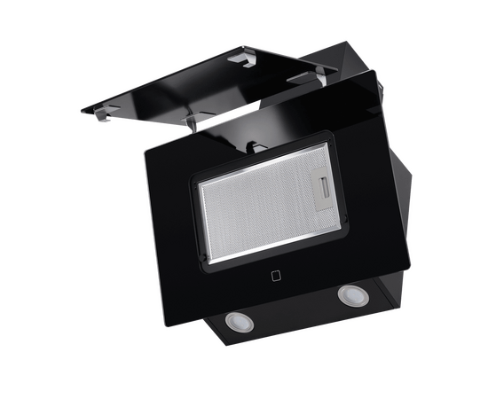 Корпус выполнен из нержавеющей стали. Фронтальная часть состоит из двух панелей из закаленного стекла белого цвета. Откидная панель надежно фиксируется магнитными упорами. За ней скрывается легко снимающийся металлический жироулавливающий фильтр. Загрязненный воздух втягивается по всему периметру откидной панели.