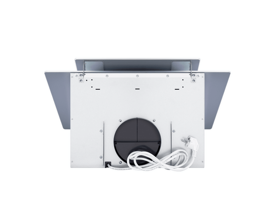 Корпус выполнен из нержавеющей стали. Фронтальная часть состоит из двух панелей из закаленного стекла черного цвета. Откидная панель надежно фиксируется магнитными упорами. За ней скрывается алюминиевый жироулавливающий фильтр, который легко снимается и полностью разбирается, что сильно упрощает чистку. Загрязненный воздух втягивается по всему периметру откидной панели.