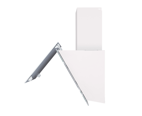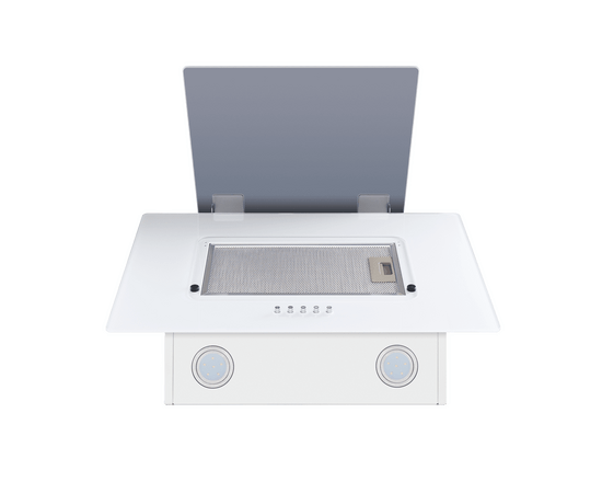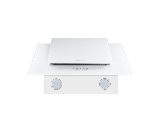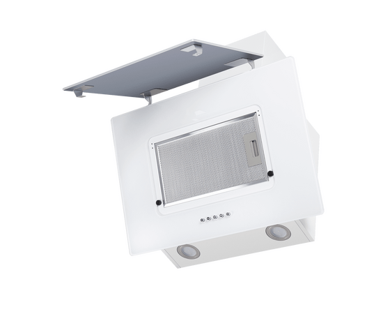 Корпус из нержавеющей стали выполнен в едином цвете с фронтальными панелями из закаленного стекла белого цвета. Откидная панель надежно фиксируется магнитными защелками и скрывает алюминиевый жироулавливающий фильтр, который легко снимается и полностью разбирается, что сильно упрощает чистку. Загрязненный воздух втягивается по всему периметру откидной панели.