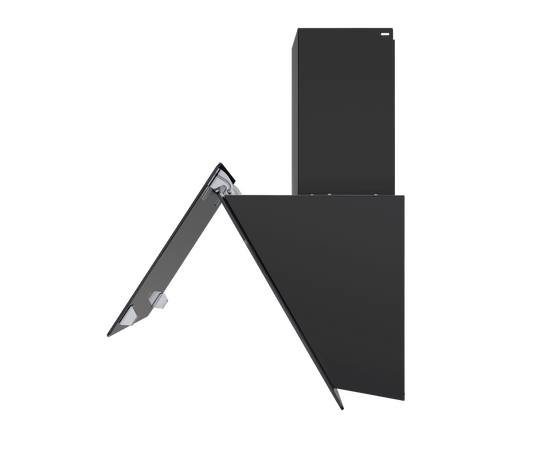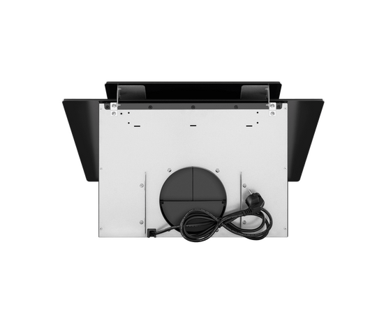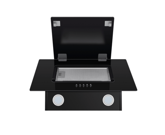 Корпус из нержавеющей стали выполнен в едином цвете с фронтальными панелями из закаленного стекла белого цвета. Откидная панель надежно фиксируется магнитными защелками и скрывает алюминиевый жироулавливающий фильтр, который легко снимается и полностью разбирается, что сильно упрощает чистку. Загрязненный воздух втягивается по всему периметру откидной панели.