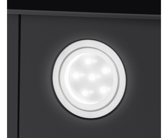 Кнопочное управление, расположенное на фронтальной панели, позволит выбрать одну из 3-х скоростей вентилятора и включить освещение (2 мощных LED-источника по 1 Вт).
