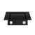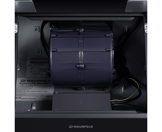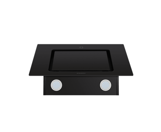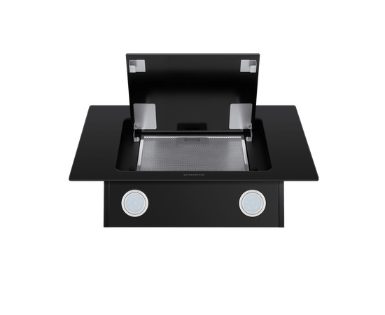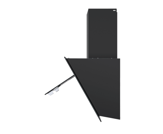 Корпус из нержавеющей стали с покрытием черного цвета удачно сочетается с фасадом, выполненным из закаленного черного стекла. Откидная панель расположена по центру фасада и скрывает металлический жироулавливающий фильтр, который легко вынимается и полностью разбирается для чистки. В данной модели реализовано периметральное втягивание загрязненного воздуха.