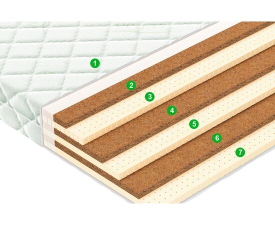 - Натуральный материал, состоящий из спрессованных волокон кокосового ореха, полностью пропитанных латексом. Слои из прочной и долговечной кокосовой койры используются для придания матрасу дополнительной жесткости.