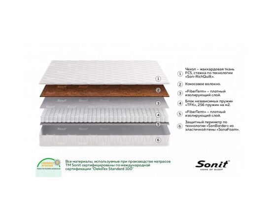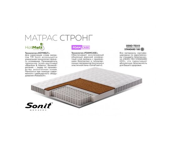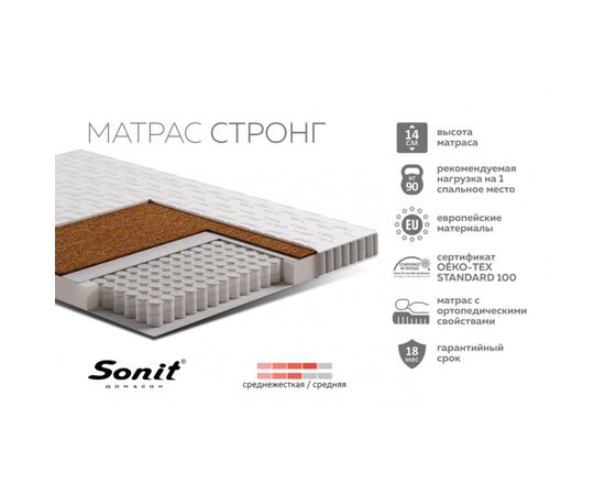 Данная модель матраса отличается небольшой высотой, поэтому Вы можете использовать его в кроватях с неглубоким местом под матрас и в детских кроватях. В основе матраса Стронг ТМ Sonit - блок независимых пружин. Каждая пружина заключена в отдельный чехол и реагирует на давление независимо от остальных, за счет этого и достигается правильная поддержка позвоночника во время сна. С одной стороны матраса - кокосовое волокно, которое придает дополнительную жёсткость поверхности и прочный изолирующий материал «Aquaspan», который защищает слои от истирания. С другой стороны плотный материал «FiberTerm». Объемная стежка чехла на холлконе и эластичной пене «SonaFoam» придает матрасу дополнительный комфорт, обеспечивает долговечность внутренних наполнителей и привлекательный внешний вид матраса. Благодаря усиленному периметру по краю из эластичной пены матрас надолго сохранит свои качества.
