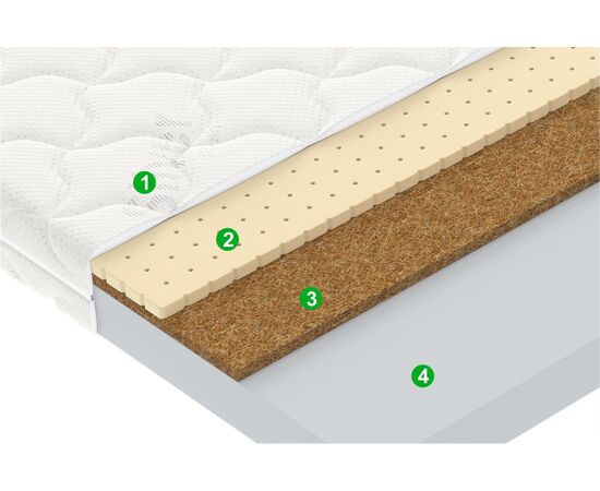 Невысокая модель на основе натуральных и искусственных материалов. Кокосовая койра придает необходимую для правильного формирования осанки жесткость, а комфортная мягкость латекса делает сон еще более глубоким и комфортным.