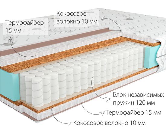 Термофайбер изготавливается из прочных полиэфирных волокон. Волокно хорошо сопротивляется сжатию, напоминая работу пружин, что придаёт матрасу дополнительный ортопедический эффект.