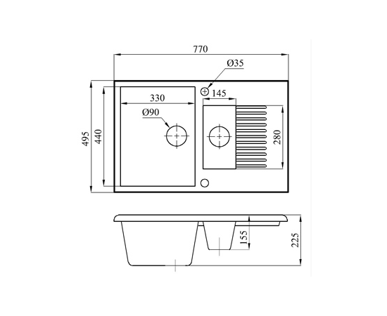 Отверстие под смеситель вырезается в зависимости от расположения крыла и чаши.