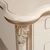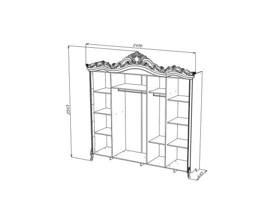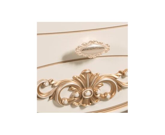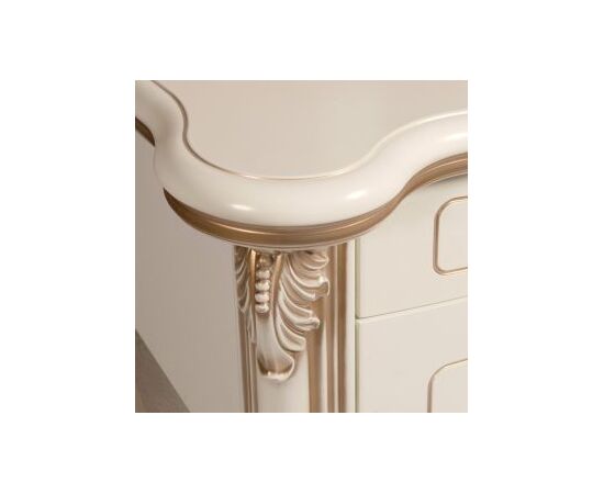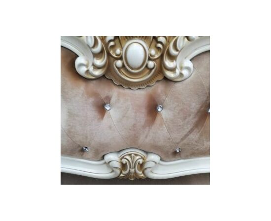 ФАСАД – крашенная фрезерованная, односторонне ламинированная, плита МДФ. На фасады наносится эмаль и ручная роспись под золото. Декоративные элементы и накладки фасадов из ППУ. Декоративные части головной и ножной спинок кровати из ППУ с мягкими элементами из ткани. Все опорные части спальни изготовленные из ППУ - повышенной прочности. Боковые двери шкафа гнутые (S-образные). КАРКАС- ламинированная ДСП.