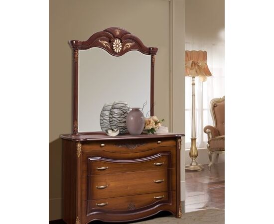 ФАСАД – крашенная фрезерованная, односторонне ламинированная, плита МДФ. На фасады наносится краситель и патина, золотая отделка. Декоративные элементы и накладки фасадов из ППУ. Декоративные части головной и ножной спинок кровати из ППУ. Боковые двери шкафа гнутые (S-образные).
