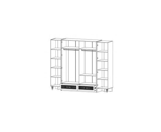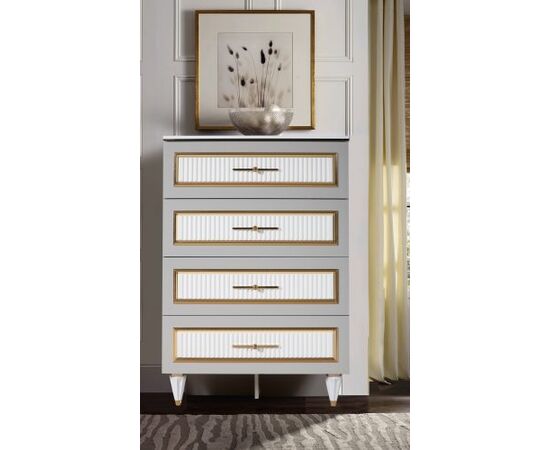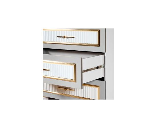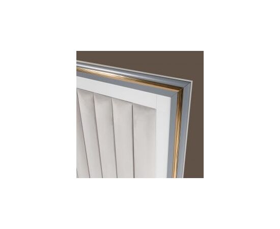 ФАСАД – из односторонне ламинированной плиты МДФ c объемной фрезеровкой и ДСП. Белые фрезерованные элементы шкафа, комода, тумб облицованы глянцевой пленкой. Серые фрезерованные элементы фасадов шкафа, крашеный МДФ. Головная спинка кровати – основа