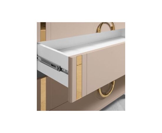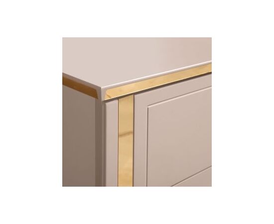 ФАСАД - односторонняя ламинированная плита МДФ облицованная плёнкой ПВХ. Используется плёнка типа «Soft-touch. Фасад спальни декорирован зеркальным пластиком. Головной щит кровати выполнен с мягким элементом и на нём применены прямоугольные пуговицы. Комод и тумбы прикроватные стоят на пластиковых опорах.