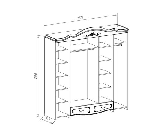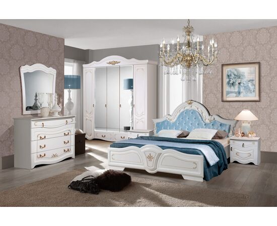 ФАСАД – крашенная фрезерованная плита МДФ, тонкая золотая фрезеровка.. Декоративная накладка головной спинки кровати из ППУ. Мягкий элемент головной спинки кровати – тканевый (вариант цвета ткани: бежевый или голубой). С ножной спинкой.
