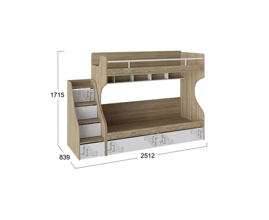 Оксфорд СМ-139.11.012 Кровать 2-х ярусная с лестницей приставной с ящиками (ривьера/белый с рисунком)