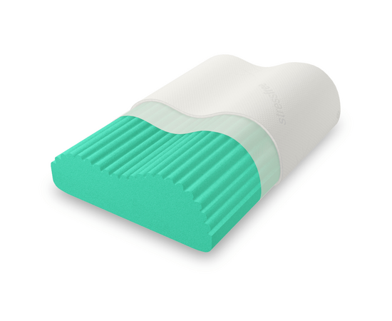 Высокая подушка эргономичной формы. Благодаря наполнению из пены MemoryFoam подушка деликатно поддерживает шею и голову в правильном положении, независимо от выбранной позы для сна. Рифленая поверхность подушки оказывает легкий микромассажный эффект и не оказывает обратного давления на сосуды.