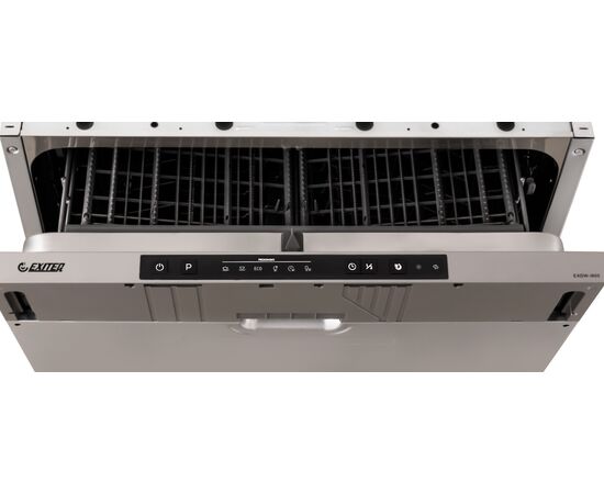 Панель управления располагается на торце двери. В модели EXDW-I605 имеется обширный набор программ: эконом, интенсивная, быстрая и др. режимы. Выбранная программа отображается на дисплее. Для удобства пользователя в программе есть опция отсроченного старта.