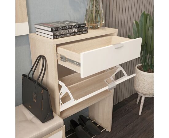 Прихожая выполнена из качественной ЛДСП, декорированной в двух оттенках: светлое дерево «Палермо» с белыми перламутровыми фасадами.