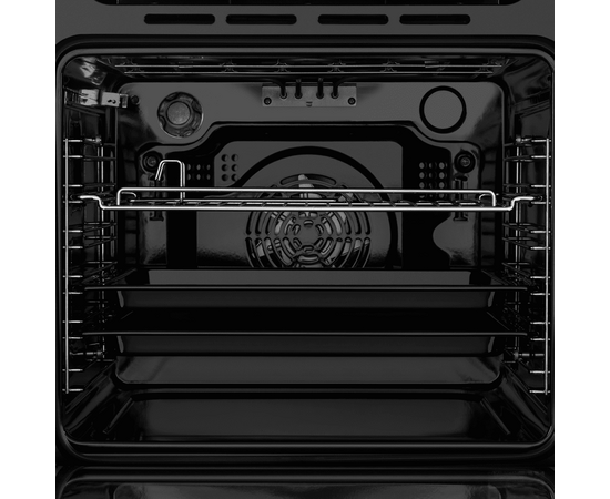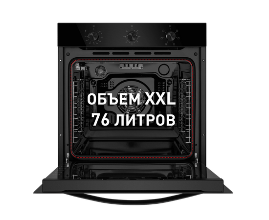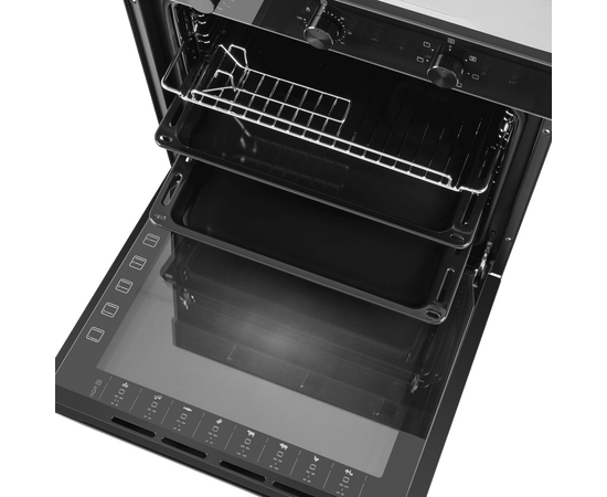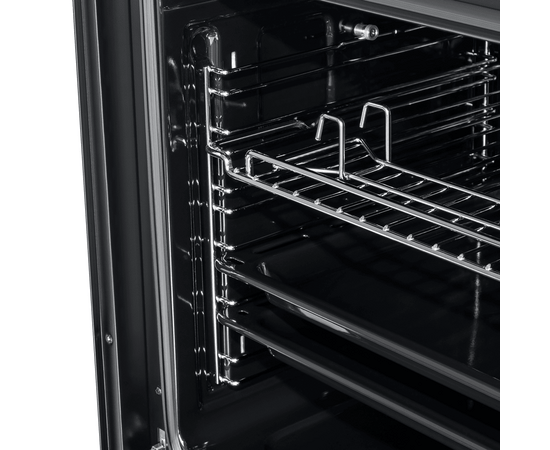 Объем 76 л при стандартных размерах 60 см позволяет готовить одновременно несколько блюд, разместив решетку или противень на одном из 6 уровней боковых направляющих. Дверца духового шкафа состоит из трех стекол, что создает холодный фронт и делает процесс приготовления безопасным, исключая возможность ожога при касании. Внутреннее стекло с тонировкой позволяет создавать визуальный эффект однородности стекла и при выключенном освещение не видно содержимое духовки.