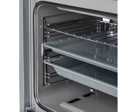 Объем 67 л при стандартной ширине духового шкафа 60 см позволяет готовить одновременно несколько блюд, разместив решетку или противень на одном из 5-ти уровней боковых направляющих. Один уровень оснащен удобными телескопическими направляющими. Внутреннее покрытие камеры выполнено из специальной легкоочищающейся эмали серого цвета.