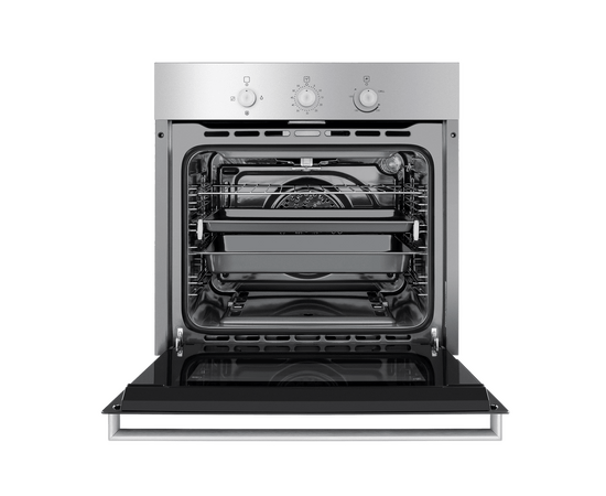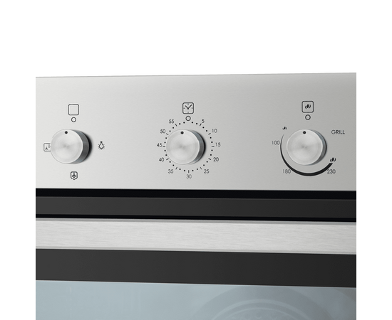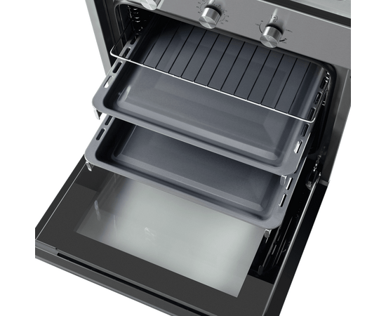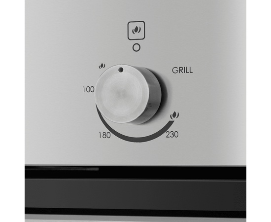 Механическое управление осуществляется цельнометаллическими поворотными ручками. Можно выбрать режим работы, температуру и установить таймер (0-60 мин). В данной модели поддерживается 4 режима работы: нижний газовый нагрев с вентилятором (конвекция), традиционная готовка, газовый гриль, освещение. Данный тип газового духового шкафа имеет отличительную характеристику – работает как при открытом, так и при закрытом гриле.