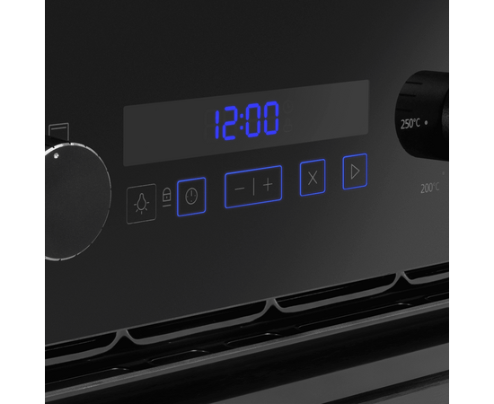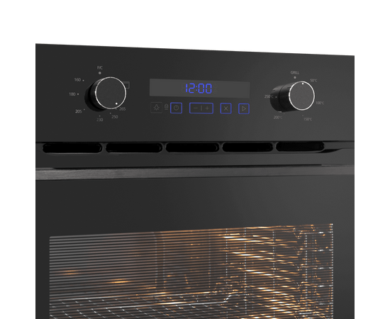 Комбинированное управление реализовано в виде сенсорного управления с подсветкой и поворотных ручек. Можно выбрать режим работы, температуру (160-265℃), установить таймер. В данной модели есть 3 режима работы: нижний нагрев с вентилятором, электрический гриль, освещение. Данная модель работает как при открытом, так и при закрытом гриле.