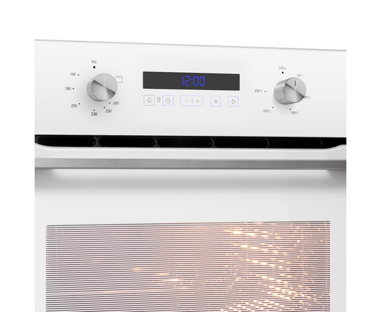 Механическое управление осуществляется цельнометаллическими поворотными ручками. Можно выбрать режим работы, температуру и установить таймер (0-60 мин). В данной модели поддерживается 4 режима работы: нижний газовый нагрев с вентилятором (конвекция), традиционная готовка, газовый гриль, освещение. Данный тип газового духового шкафа имеет отличительную характеристику – работает как при открытом, так и при закрытом гриле.