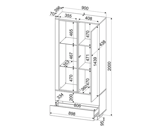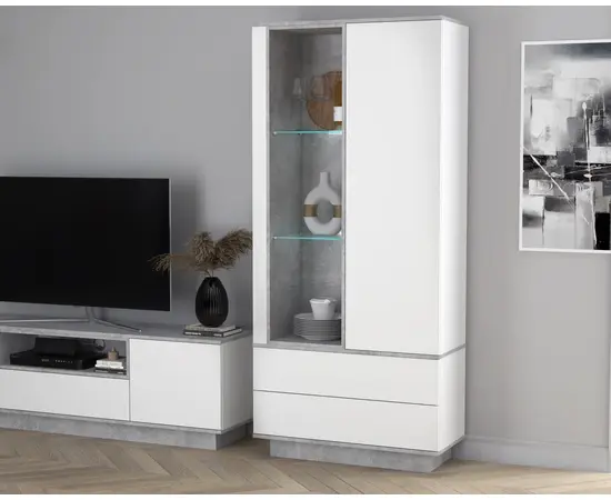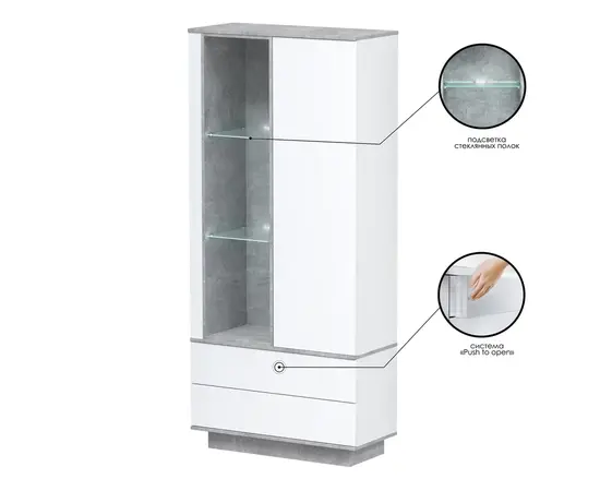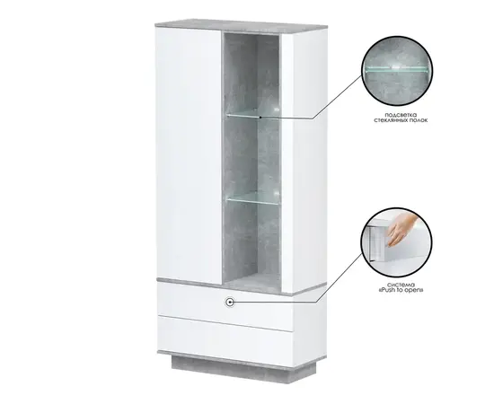 Универсальная сборка, двери механизм push-to-open, выдвижные ящики с направляющими с встроенным механизмом push-to-open, открытые полки из закаленного стекла, подлежит креплению к стене. Возможна комплектация подсветкой, стоимость указана без учета подсветки.