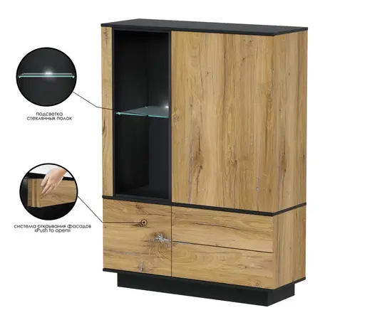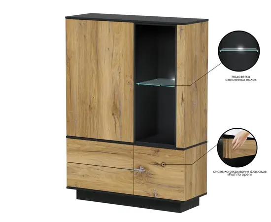 Универсальная сборка, двери механизм push-to-open, выдвижные ящики с направляющими с встроенным механизмом push-to-open, открытые полки из закаленного стекла, подлежит креплению к стене. Возможна комплектация подсветкой, стоимость указана без учета подсветки.