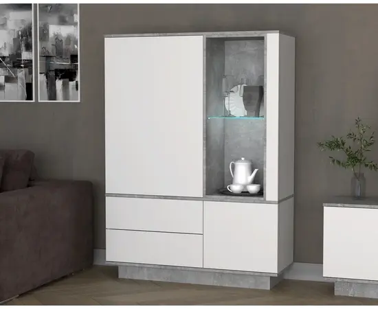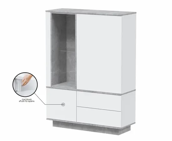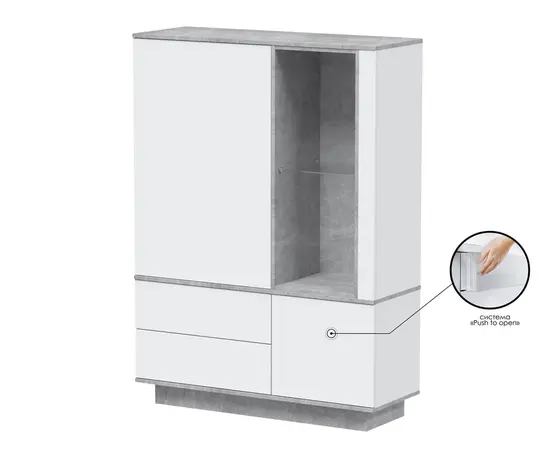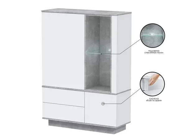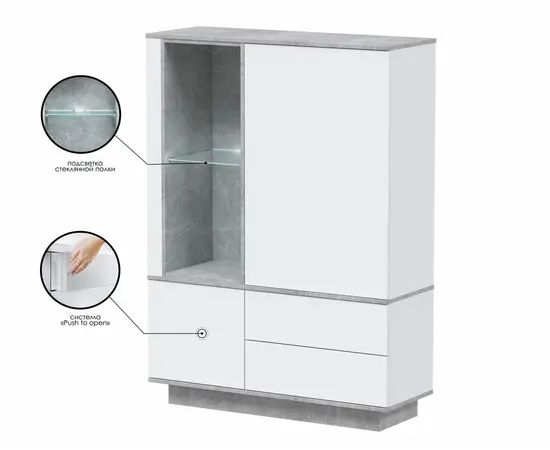 Универсальная сборка, двери механизм push-to-open, выдвижные ящики с направляющими с встроенным механизмом push-to-open, открытые полки из закаленного стекла, подлежит креплению к стене. Возможна комплектация подсветкой, стоимость указана без учета подсветки.