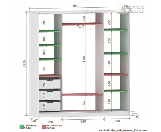 Шкаф-купе СЕНАТОР ШК12-45 классика 2050/2216/450 (дуб сонома) 1 зеркало