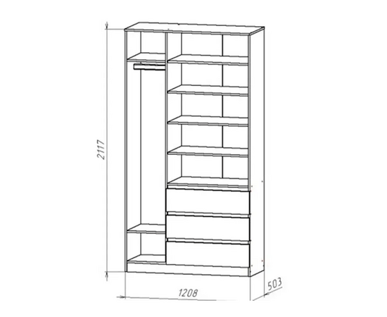 - Кобинированный, за двумя дверками 4 полки, 3 ящика; за одной дверкой штанга и две полки.