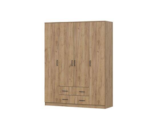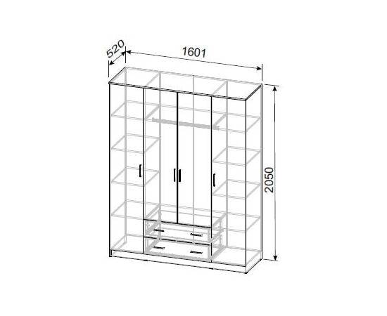 Шкаф комплектуется распашными створками и разделен вертикальными перегородками на 3 отделения. По краям располагаются бельевые отделения шириной 384 мм. В каждой из них устанавливается по четыре полки. Посередине отделение шириной 768 мм. В нижней части отделения расположена секция с двумя выдвижными ящиками, в верхней - платяное отделение высотой 1512 мм с одной полкой сверху и металлической штангой.
