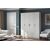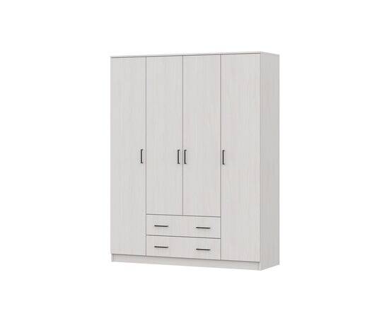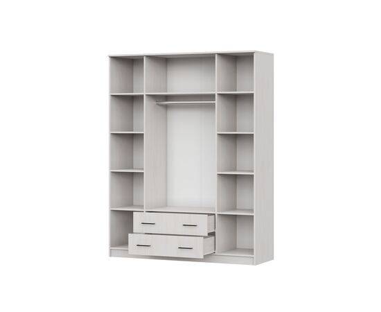 Шкаф комплектуется распашными створками и разделен вертикальными перегородками на 3 отделения. По краям располагаются бельевые отделения шириной 384 мм. В каждой из них устанавливается по четыре полки. Посередине отделение шириной 768 мм. В нижней части отделения расположена секция с двумя выдвижными ящиками, в верхней - платяное отделение высотой 1512 мм с одной полкой сверху и металлической штангой.