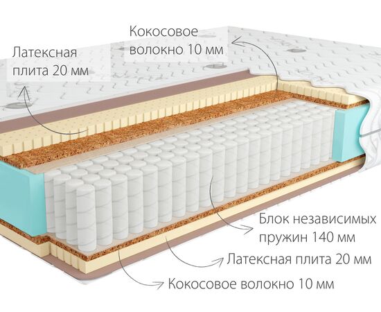 Матрас из латексных плит и листов кокосовых волокон прекрасно справляется с задачей создать наилучшие условия для полноценного сна. Модель отличается мягкостью, так как натуральный латекс обладает значительной эластичностью, а также хорошо вентилируется.