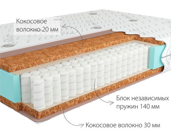 Очень жесткий матрас с настилами из натуральной кокосовой койры. Волокна кокоса сохраняют упругость и эластичность на протяжении многих лет, а также обладают прекрасной воздухопроницаемостью, влагоустойчивостью и бактерицидными свойствами.