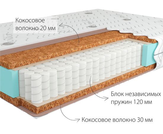Жесткий матрас с настилами из натуральной кокосовой койры. Волокна кокоса сохраняют упругость и эластичность на протяжении многих лет, а также обладают прекрасной воздухопроницаемостью, влагоустойчивостью и бактерицидными свойствами. Блок независимых пружин «Mini» 440 пружин на спальное место.