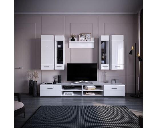 Стенка Кай - это универсальный комплект модулей в современных нейтральных тонах, простота форм и лаконичность которого позволяют вписаться в любой интерьер. Фасады МДФ с витринами и горизонтальной фрезеровкой добавляют динамики, делая композицию более яркой и выразительной. Контрастная задняя стенка и ручки черного цвета подчеркивают стиль и индивидуальность, оттеняют белоснежные глянцевые фасады. Функциональные шкафы и тумба для ТV обеспечивают удобство и простоту использования.