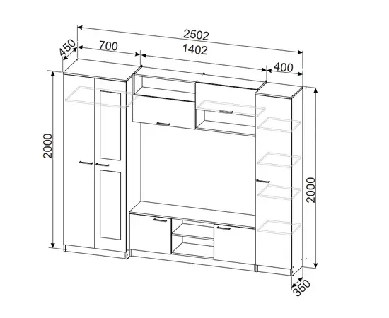 •Габариты Мебель для гостиной МГС 3 Исполнение 1 (ШхВхГ) - 2502х2000х450мм