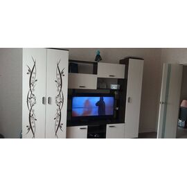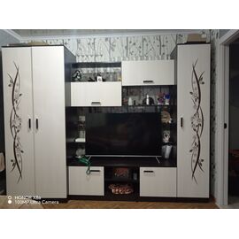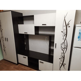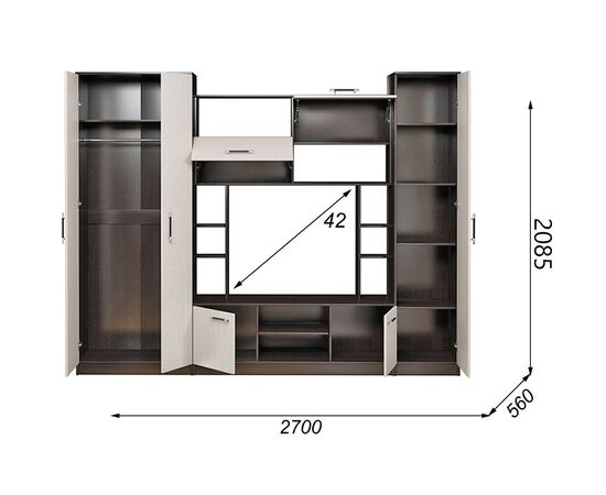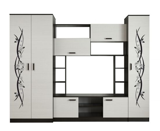 Стенка «Престиж» с нанесенным рисунком по технологии УФ (ультрафиолетовая) печать. Стильная стенка для гостиной длиной 2,7 метра. Корпуса и фасады изготавливаются ил ЛДСП, темный корпус с текстурой дуба венге, светлые фасады с текстурой бодега. Правая и левая секции шкафа взаимозаменяемые!
