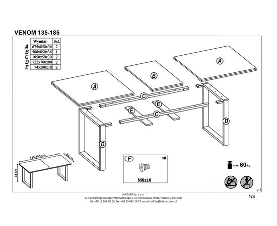 Стол обеденный VENOM раскладной, дуб вотан/черный, 135-185/85/74