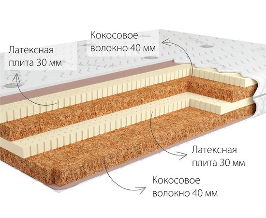 Превосходный современный матрас, гарантирующий возможность легко расслабиться, с удовольствием выспаться и хорошо отдохнуть. Чередование слоев натурального латекса и листов кокосовых волокон создает универсальную среднюю степень жесткости. Естественное положение позвоночника во время сна самым благоприятным образом сказывается на его состоянии и самочувствии человека.